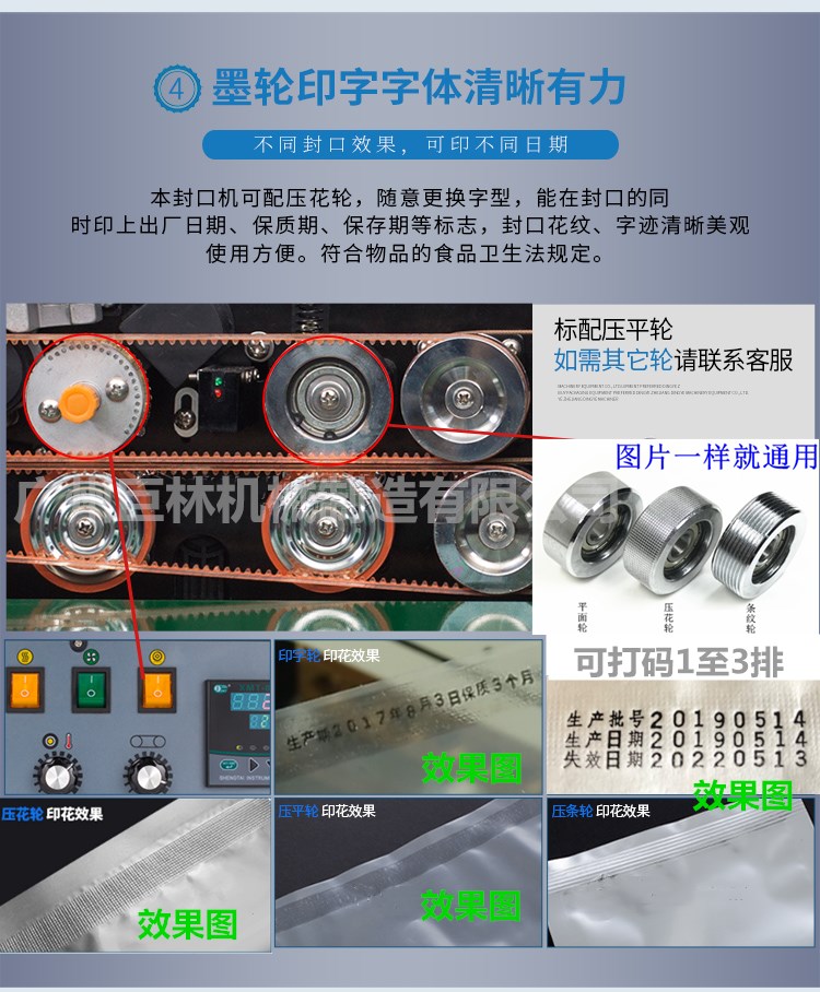 該機(jī)具有連續(xù)輸送、封口、油墨印制標(biāo)簽(出廠日期、生產(chǎn)批號(hào)等)一次完成之功效,可封合印制任何一種可熱性的薄膜。