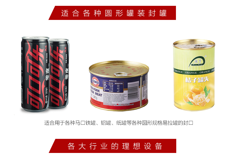 4、適用于各種馬口鐵罐、鋁合金罐、紙罐等各種圓形規(guī)格易拉罐的封口,操作簡(jiǎn)單易學(xué),是食品、飲料、制藥等行業(yè)的理想設(shè)備
